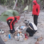 Die wenigen und freien Campingplätze im Park sind sehr spartanisch (außer einem Dixi-Klo gibt es nichts), aber natürlich in tollster Umgebung gebaut. Wasser zum Kochen und Trinken holt man sich aus irgendeinem der vielen Flüsse (alles Trinkwasser direkt vom Gletscher). Nach 3 Stunden Wanderung erreichten wir unseren Campingplatz und 10 Minuten später standen die Zelte. Mit Steinen bauten wir einen Windschutz für den Gaskocher, auf dem die Mädls Abends erneut ein super leckeres Poleta –